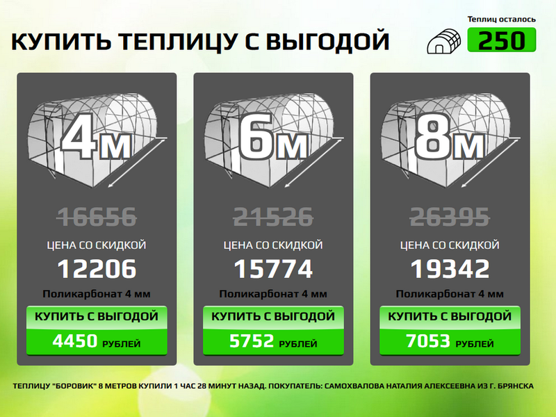 И, наконец, все перечисленные элементы лэндинга плавно приводят нас к самой важной его части - форме покупки товара. Она состоит из 3-х больших "кнопок", на которых чётко отображена необходимая информация для принятия решения, а счётчик оставшихся теплиц и информация о предыдущей покупке закрепляют уверенность клиента в заказе теплицы.