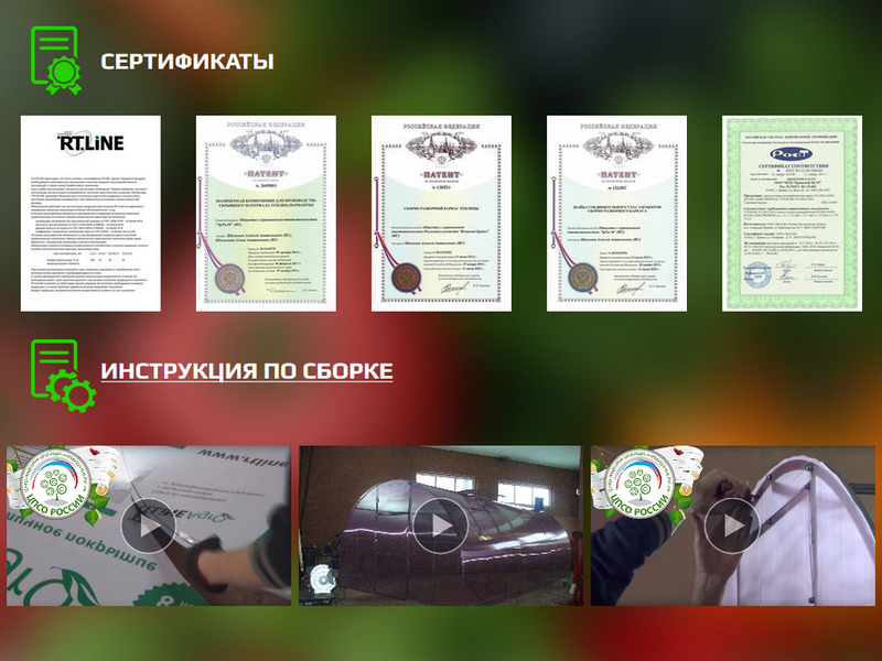 Затем идёт документальное подтверждения качества продукции в виде сертификатов и патентов, призванное закрепить доверие клиента, и видеоинструкции по сборке теплицы для более подробного изучения товара клиентом.