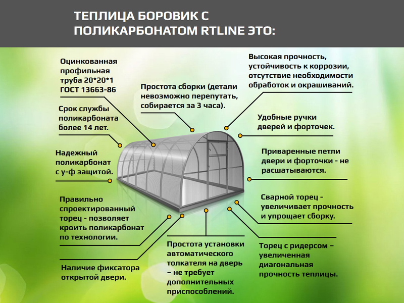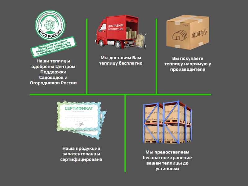 Следом за видео Мы видим наглядное отображение преимуществ как самой теплицы "Боровик", так и покупки теплицы в компании RTLINE Agro, которые сопровождаются картинками для лучшего восприятия и читаемости.